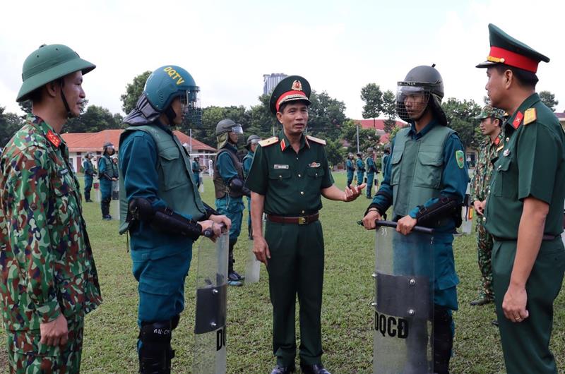 Thiếu tướng Đặng Văn Hùng kiểm tra trực tiếp đại đội dân quân thường trực luân phiên đang huấn luyện tại Bộ Chỉ huy quân sự tỉnh