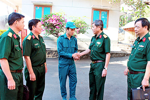 Chỉ huy trưởng Bộ CHQS tỉnh, Đại tá Trần Ngọc Khải (thứ hai từ phải sang) động viên thanh niên chuẩn bị nhập ngũ.