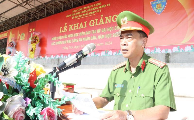 Đến dự và chỉ đạo lễ khai giảng, Đại tá Phùng Văn Chiến, Phó Tư lệnh Cảnh sát Cơ động, dự chúc mừng 692 học viên trúng tuyển hệ chính quy các trường thuộc Bộ Công an. Đại tá Phùng Văn Chiến cho biết, trải qua 50 năm xây dựng, chiến đấu, phát triển và trưởng thành, các thế hệ cán bộ chiến sĩ lực lượng Cảnh sát cơ động luôn nêu cao bản lĩnh chính trị, trung thành tuyệt đối với Đảng, Nhà nước, Nhân dân, Chế độ xã hội chủ nghĩa và ngày càng khẳng định vai trò là lực lượng nòng cốt trong thực hiện biện pháp vũ trang bảo vệ an ninh quốc gia, bảo đảm trật tự an toàn xã hội; mưu trí, sáng tạo, dũng cảm, hoàn thành xuất sắc nhiệm vụ; đặc biệt tham mưu Bộ Công an hoàn thành thắng lợi nhiệm vụ chính trị quan trọng, trong đó có huấn luyện đầu khóa học viên các trường thuộc Bộ Công an.