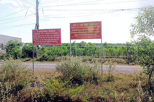 UBND xã Long Phước cắm biển thông báo cho người dân biết thông tin về các khu đất chưa được cấp phép tách thửa.