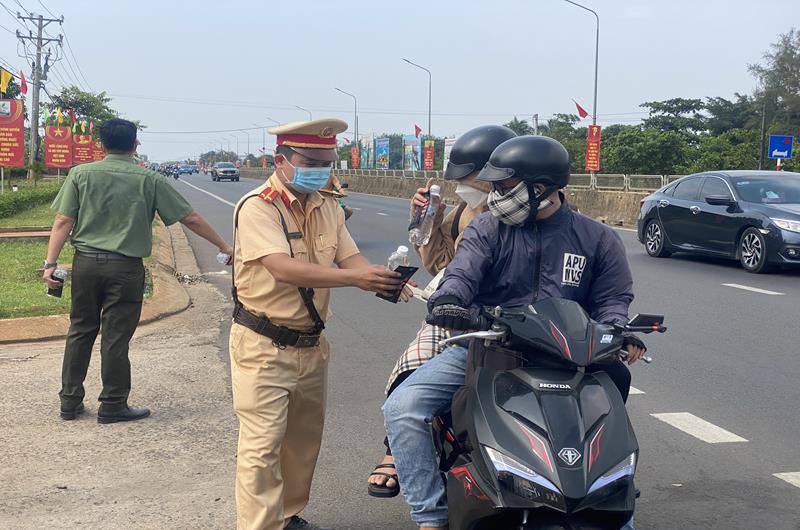 Lực lượng Đoàn thanh niên Công an H.Thống Nhất phát nước, khăn lạnh cho người dân về quê dịp lễ 30-4