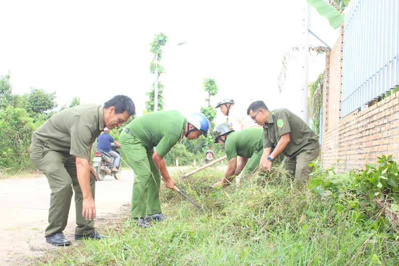 Công an huyện Tân Phú tham gia làm đường, phát quang bụi rậm tại xã Phú Bình, huyện Tân Phú