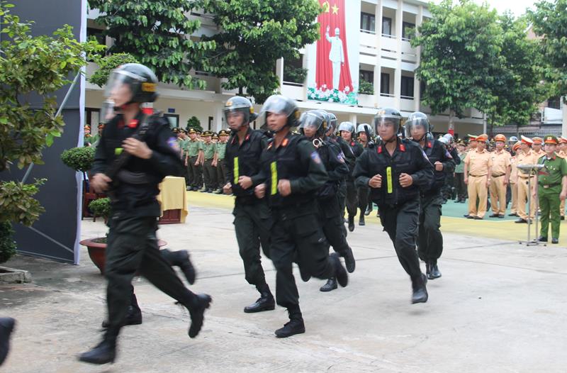 Lực lượng cảnh sát cơ động triển khai đội hình diễu hành trong lễ ra quân tấn công, trấn áp tội phạm, đảm bảo an toàn giao thông dịp nghỉ lễ 2-9 do Công an tỉnh tổ chức.