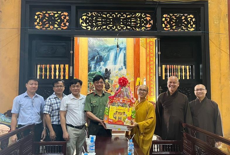 Đại diện Phòng An ninh nội địa tặng quà các cơ sở phật giáo dịp lễ Phật đản vào tháng 5-2023