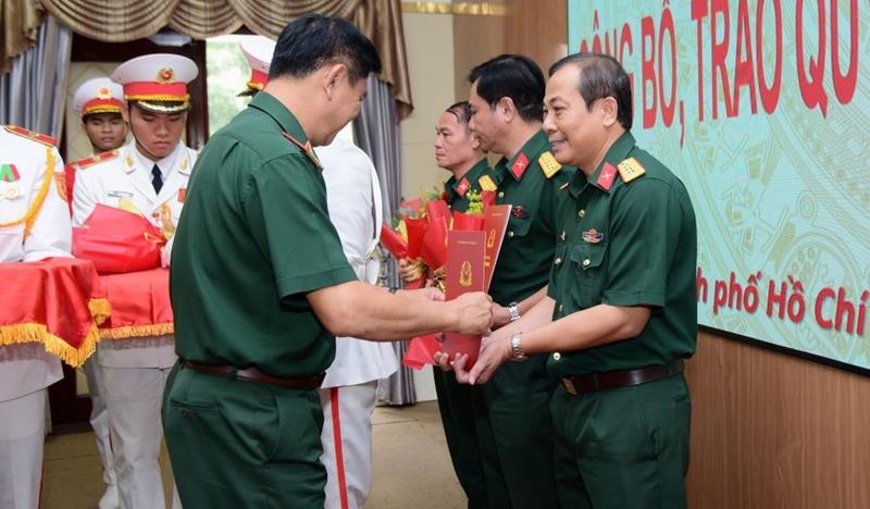Trung tướng Nguyễn Trường Thắng trao quyết định của Bộ Quốc phòng về điều động, bổ nhiệm Đại tá Vũ Văn Điền về công tác tại Bộ Tư lệnh TP.Hồ Chí Minh. Ảnh Tuấn Anh