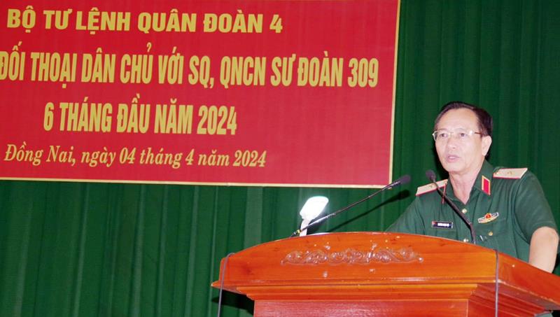 Bí thư Đảng ủy Quân đoàn 4 đề nghị, Đảng ủy, chỉ huy Sư đoàn 309 tiếp tục phát huy kết quả đạt được, tăng cường các hoạt động đối thoại dân chủ; tiếp thu, ghi nhận những ý kiến đóng góp, xây dựng, hiến kế nâng chất công tác huấn luyện và thực hiện nhiệm vụ chuyên môn. Làm tốt công tác tư tưởng, kịp thời giải đáp các vấn đề nảy sinh trong thẩm quyền, tạo môi trường dân chủ, động viên cán bộ, sĩ quan, QNCN đoàn kết xây dựng Đảng bộ trong sạch vững mạnh, xây dựng đơn vị vững mạnh toàn diện, “ Mẫu mực, tiêu biểu”, hoàn thành xuất sắc nhiệm vụ được giao.