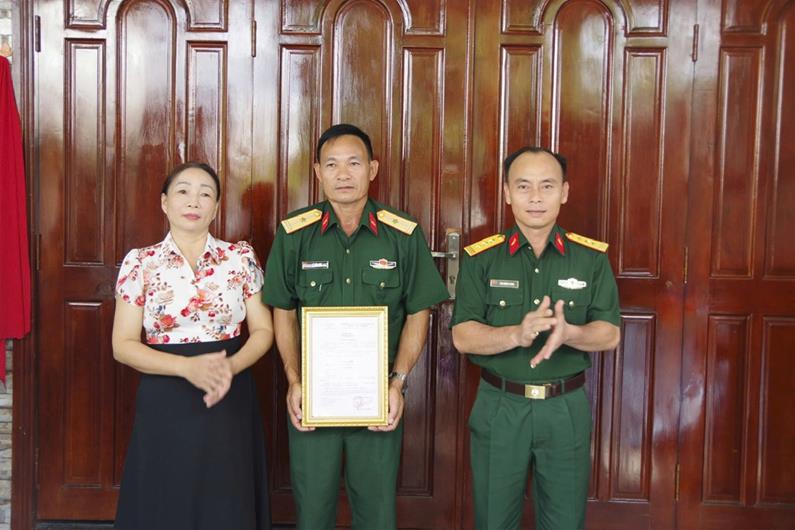 Thượng tá Cao Hoàng Phong (bìa phải), Phó Chính ủy Lữ đoàn 26 trao quyết định tặng nhà đồng đội cho gia đình Thiếu tá chuyên nghiệp Lê Văn Sơn