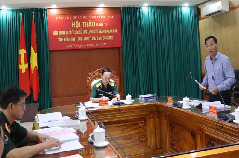 Chiều 12-7, Đại tá Huỳnh Thanh Liêm, Phó Bí thư thường trực Đảng ủy, Chính ủy Bộ Chỉ huy quân sự (CHQS) tỉnh chủ trì Hội thảo lần I biên soạn sách “Lịch sử Lực lượng vũ trang (LLVT) nhân dân tỉnh Đồng Nai (1945-2020)” (tái bản bổ sung). Tham dự có Ủy viên Ban TVUT, Trưởng ban Tuyên giáo Tỉnh ủy Phạm Xuân Hà và các thành viên Ban biên soạn.