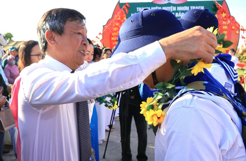 Bí thư Huyện uỷ Nhơn Trạch Lê Thành Mỹ trao vòng hoa cho tân binh