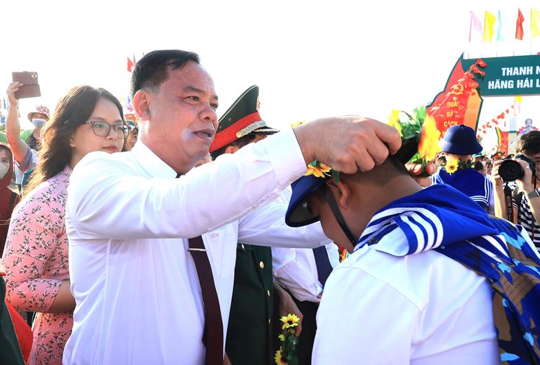 Phó Bí thư Thường trực Tỉnh uỷ Hồ Thanh Sơn trao vòng hoa cho tân binh