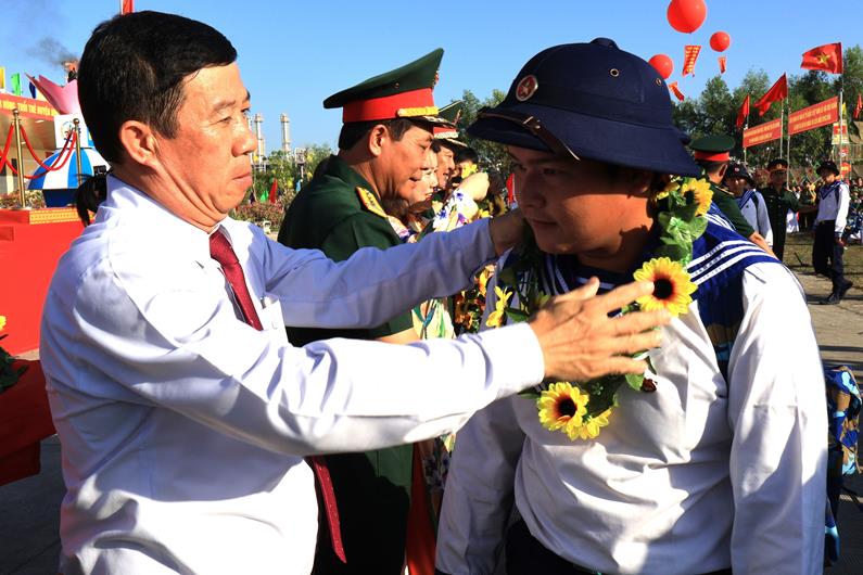 Quyền Chủ tịch UBND tỉnh Võ Tấn Đức trao vòng hoa cho tân binh