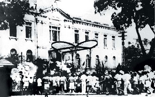 Đoàn người biểu tình ngày 19-8-1945 trước cửa Bắc Bộ phủ (Ảnh tư liệu).