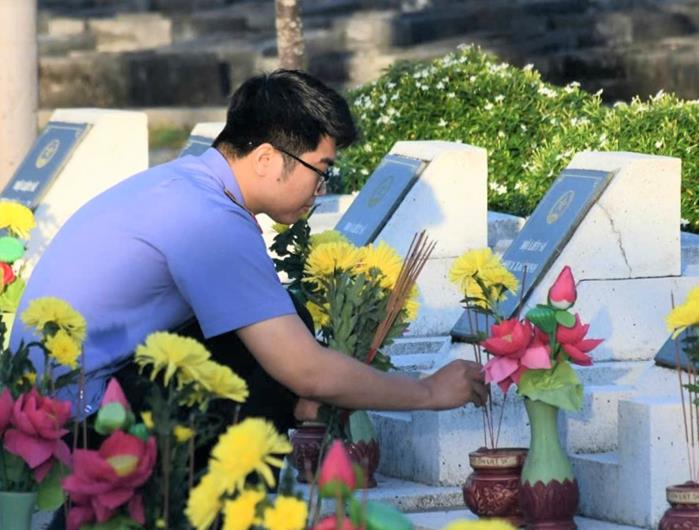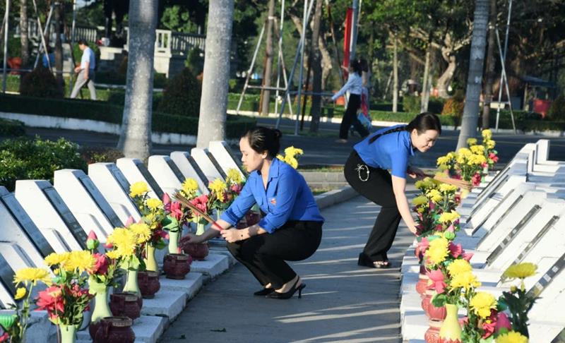 Các đoàn viên thắp hương tại các phần mộ liệt sĩ