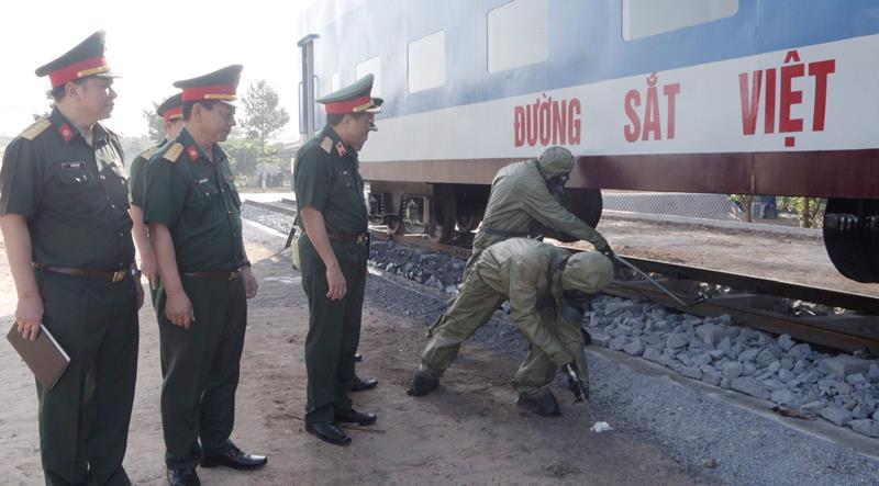 Đoàn kiểm tra xử lý sự cố hóa học đột xuất khi tàu lửa đang vận hành bị sự cố- Ảnh Tú Cường