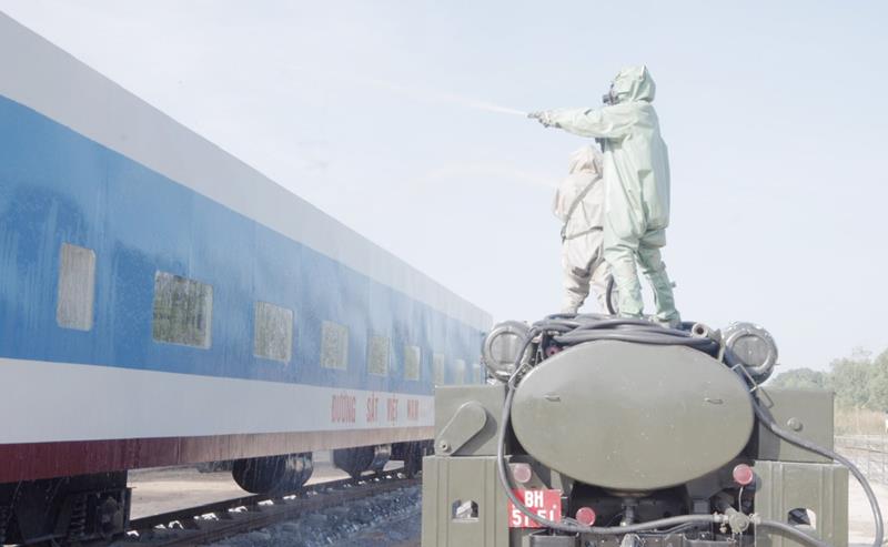 Cán bộ chiến sĩ Lữ đoàn 87 xử lý sự cố hóa chất trên tàu hỏa- Ảnh Tú Cường