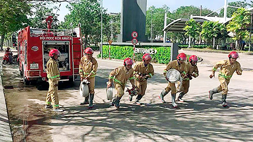 Lực lượng PCCC chuyên ngành Công ty CP Đô thị Amata Biên Hòa Biên Hòa tham gia diễn tập xử lý sự cố cháy nổ.