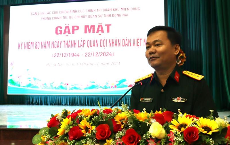 (CTT-Đồng Nai) - Chia sẻ trong buổi gặp mặt các Cựu chiến binh (CCB) Cục Chính trị Quân khu miền Đông nhân kỷ niệm 80 năm Ngày thành lập Quân đội nhân dân (QĐND) Việt Nam; 80 năm Ngày truyền thống Tổng cục Chính trị QĐND Việt Nam; 35 năm Ngày hội Quốc phòng toàn dân (22-12) mới đây, Đại tá Bùi Đăng Ninh, Phó Bí thư thường trực Đảng ủy Quân sự, Chính ủy Bộ CHQS tỉnh nhấn mạnh.