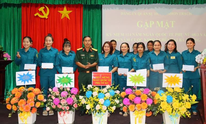 Phó Bí thư Đảng ủy Quân sự huyện Nhơn Trạch tặng hoa, chúc mừng nữ quân nhân đơn vị
