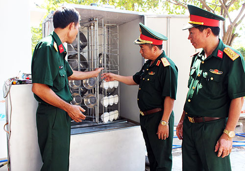 Lãnh đạo Quân đoàn 4 và Sư đoàn 309 nghe giới thiệu về Máy rửa chén TĐ250.