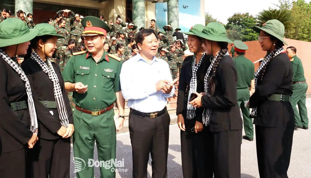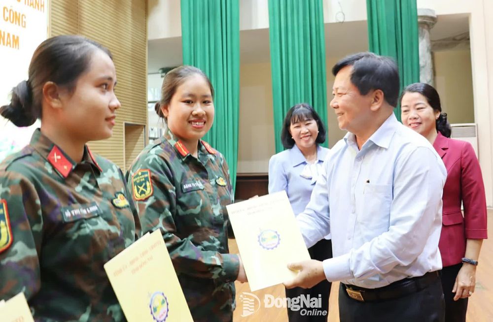 Tỉnh ủy viên, Phó Chủ tịch HĐND tỉnh Đồng Nai Trần Văn Mi tặng quà, động viên nữ quân nhân Đồng Nai tham gia nhiệm vụ A80 tại Trung tâm Huấn luyện quân sự quốc gia 4. Ảnh: Nguyệt Hà