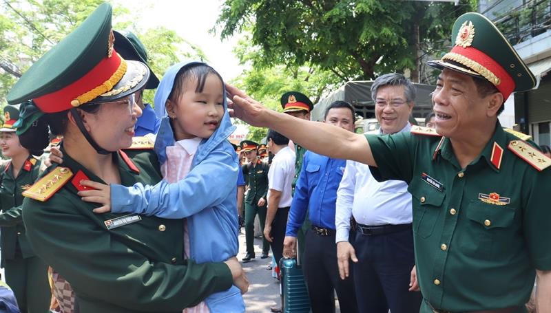 Thượng tướng Nguyễn Văn Nghĩa động viên thăm hỏi mẹ con Đại úy chuyên nghiệp Nguyễn Thị Thùy Dương, đoàn Nghi lễ quân đội