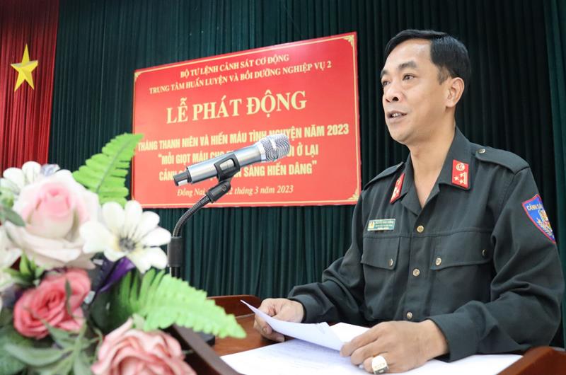 TTĐT - Ngày 12-3, Trung tâm Huấn luyện và Bồi dưỡng nghiệp vụ 2 thuộc Bộ Tư lệnh Cảnh sát cơ động (gọi tắt là Trung tâm) đóng tại xã An Phước, H.Long Thành phát động tháng thanh niên và hiến máu tình nguyện năm 2023 với chủ đề: “Mỗi giọt máu cho đi, một cuộc đời ở lại, cảnh sát cơ động sẵn sàng hiến dâng”.