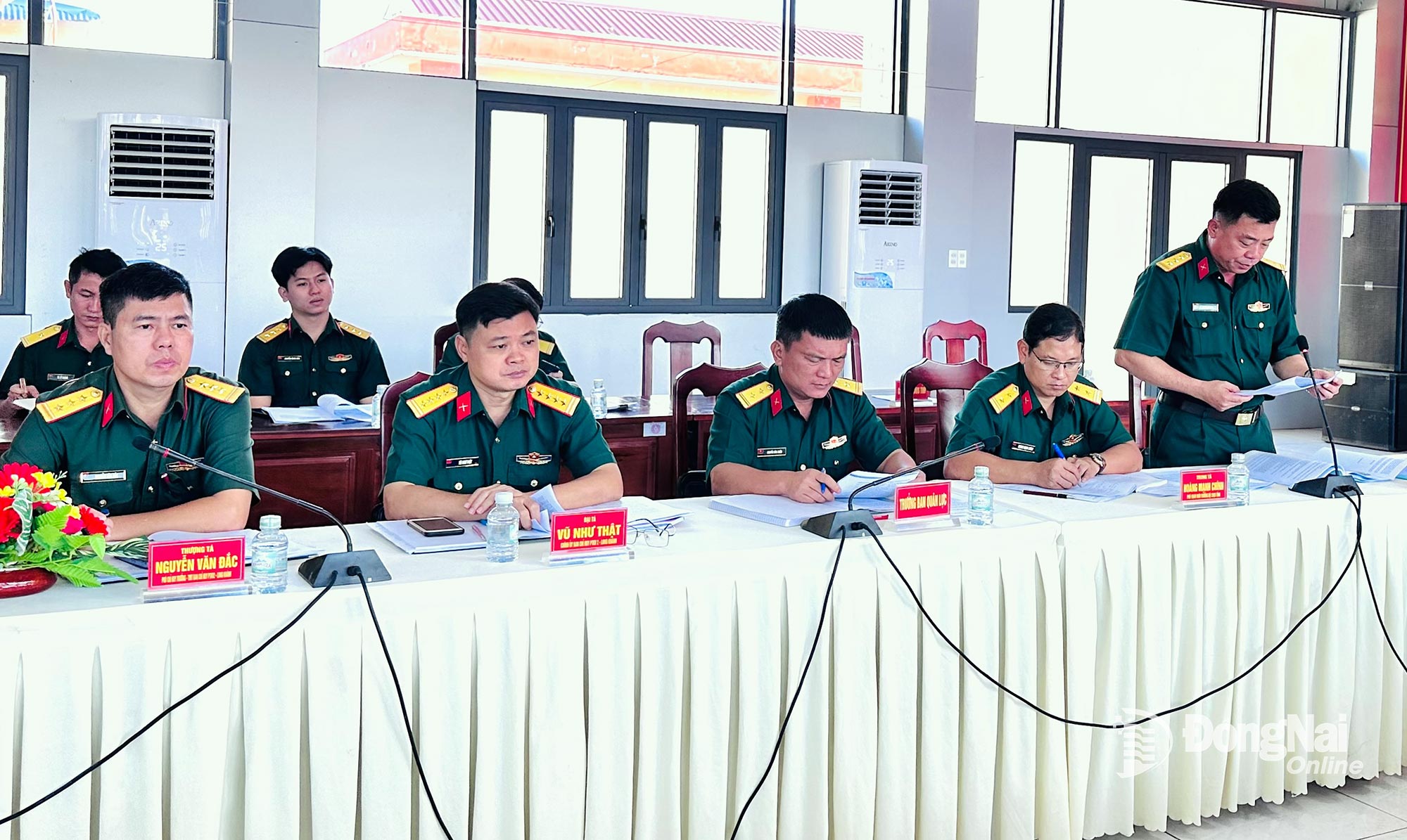 Thượng tá Phạm Minh Trí, Phó Chỉ huy trưởng Bộ Chỉ huy Quân sự tỉnh Đồng Nai báo cáo với đoàn kiểm tra. Ảnh: Văn Chung