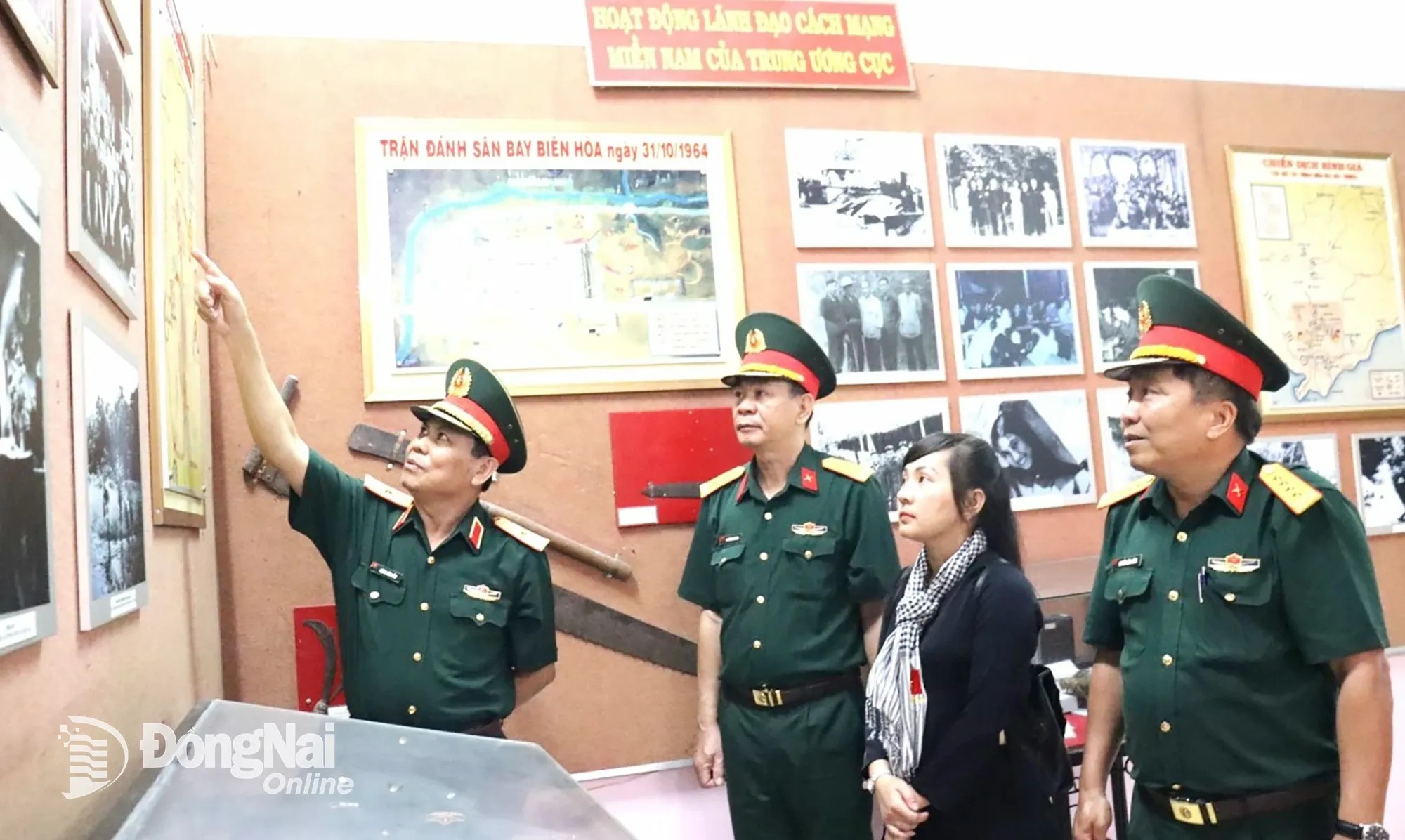 Thiếu tướng Đặng Văn Lẫm và các đại biểu tham quan nhà trưng bày lưu niệm trong khuôn viên Căn cứ Trung ương Cục miền Nam thời kỳ 1961 - 1962. Ảnh: Nam Anh