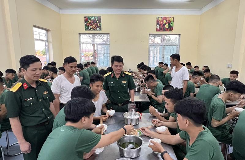 Chủ nhiệm Chính trị Lữ đoàn 96 và cán bộ tiểu đoàn, đại đội kiểm tra, động viên chiến sĩ mới trong bữa ăn sáng đầu tiên