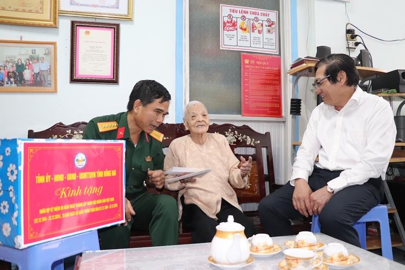 Phó Chủ tịch UBND tỉnh Nguyễn Sơn Hùng cùng lãnh đạo Bộ Chỉ huy quân sự tỉnh trò chuyện, hỏi thăm sức khỏe Bà mẹ Việt Nam anh hùng Nguyễn Thị Mùi (thành phố Biên Hòa)