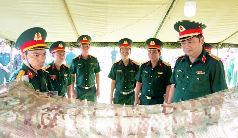 Thiếu tướng Lê Xuân Thế (bìa phải) thăm quan khu chuẩn bị huấn luyện nhiệm vụ A50 tại Trung đoàn 31, Sư đoàn 309