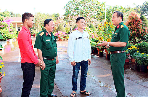 Đại tá Vũ Văn Điền, Phó chỉ huy trưởng, Tham mưu trưởng Bộ CHQS tỉnh (bìa phải) động viên thanh niên trước ngày lên đường nhập ngũ.