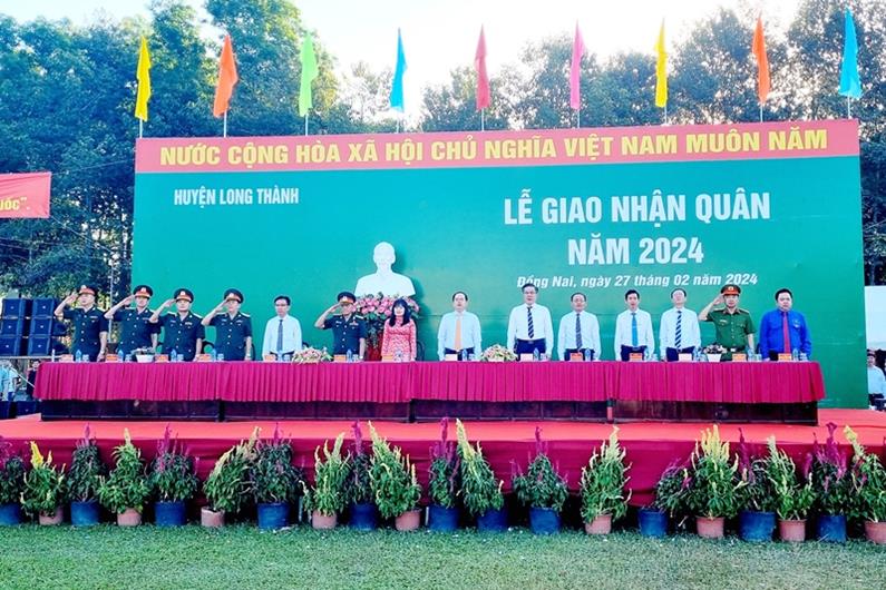Về dự lễ giao quân có các đồng chí Quản Minh Cường, Phó Bí thư Tỉnh ủy, Trưởng Đoàn đại biểu Quốc hội tỉnh; Dương Minh Dũng, Ủy viên Ban TVTU, Bí thư Huyện ủy Long Thành; Lê Văn Tiếp, Phó Bí thư Huyện ủy, Chủ tịch UBND huyện, Chủ tịch Hội đồng Nghĩa vụ Quân sự huyện Long Thành.
