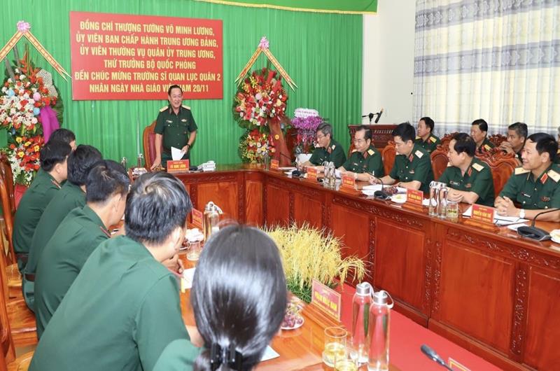 Ngày 14-11, đồng chí Thượng tướng Võ Minh Lương, Ủy viên Trung ương Đảng, Ủy viên Thường vụ Quân ủy Trung ương, Thứ trưởng Bộ Quốc phòng dẫn đầu đoàn công tác đến thăm, chúc mừng Trường Sĩ quan Lục quân (SQLQ) 2 (Đại học Nguyễn Huệ) đóng tại TP.Biên Hòa, tỉnh Đồng Nai nhân kỷ niệm 40 năm Ngày Nhà giáo Việt Nam.