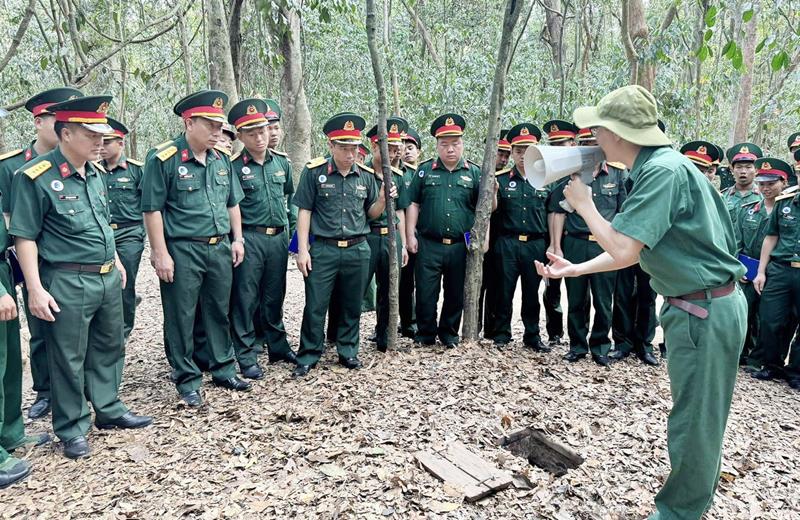 Cán bộ, chiến sĩ tham quan và nghe giới thiệu về cách xuống Địa đạo Củ Chi.