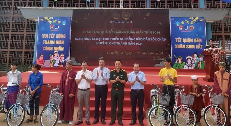 Lãnh đạo H.Long Thành và Thủ trưởng Bộ CHQS tỉnh trao xe đạp cho học sinh khó khăn học giỏi sống tốt