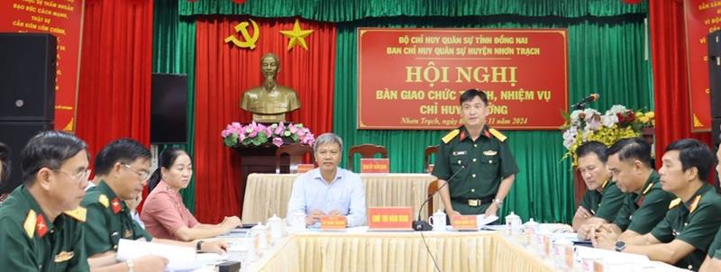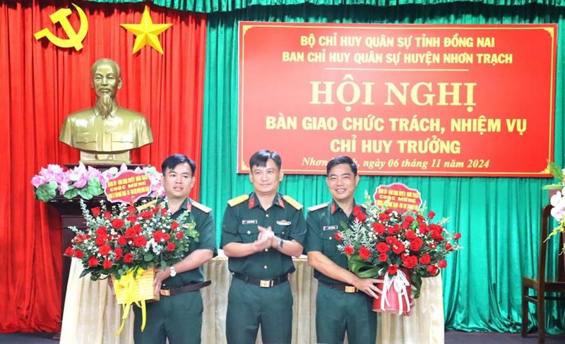 (CTT- Đồng Nai) - Chiều 6-11, các đồng chí Từ Nam Thành, Bí thư Huyện ủy Nhơn Trạch và Đại tá Phan Quốc Việt, Chỉ huy trưởng Bộ CHQS tỉnh chứng kiến bàn giao chức trách, nhiệm vụ Chỉ huy trưởng Ban Chỉ huy quân sự (CHQS) huyện Nhơn Trạch giữa Thượng tá Lại Như Thanh, Phó Tham mưu trưởng Sư đoàn 5, Quân khu 7, nguyên Chỉ huy trưởng Ban CHQS huyện Nhơn Trạch bàn giao chức vụ Chỉ huy trưởng Ban CHQS huyện cho Trung tá Trần Nhất Trung, nguyên Trưởng ban Quân báo, Bộ CHQS tỉnh.