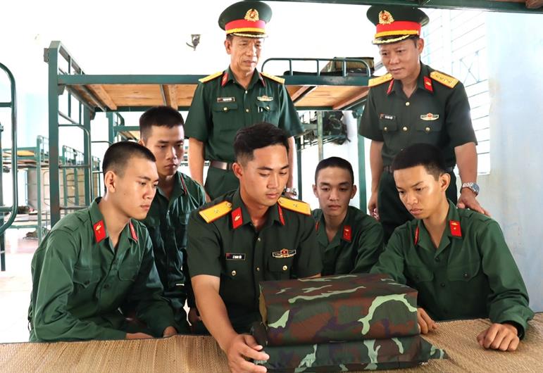 Thủ trưởng nhà trường trực tiếp kiểm tra cán bộ trung đội hướng dẫn tân binh gấp, xếp nội vụ