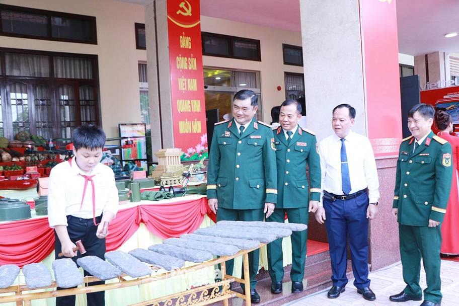 Thiếu tướng Lê Xuân Thế (thứ 2 từ trái qua), Tư lệnh Quân khu 7 và đồng chí Võ Tấn Đức (thứ 2 từ phải qua), Phó Bí thư Tỉnh ủy Đồng Nai tham quan và nghe tiếng đàn đá của con nuôi đồn biên phòng tại Đại hội Đại biểu Đảng bộ Quân sự tỉnh nhiệm kỳ 2025-2030. Ảnh: Nguyệt Hà