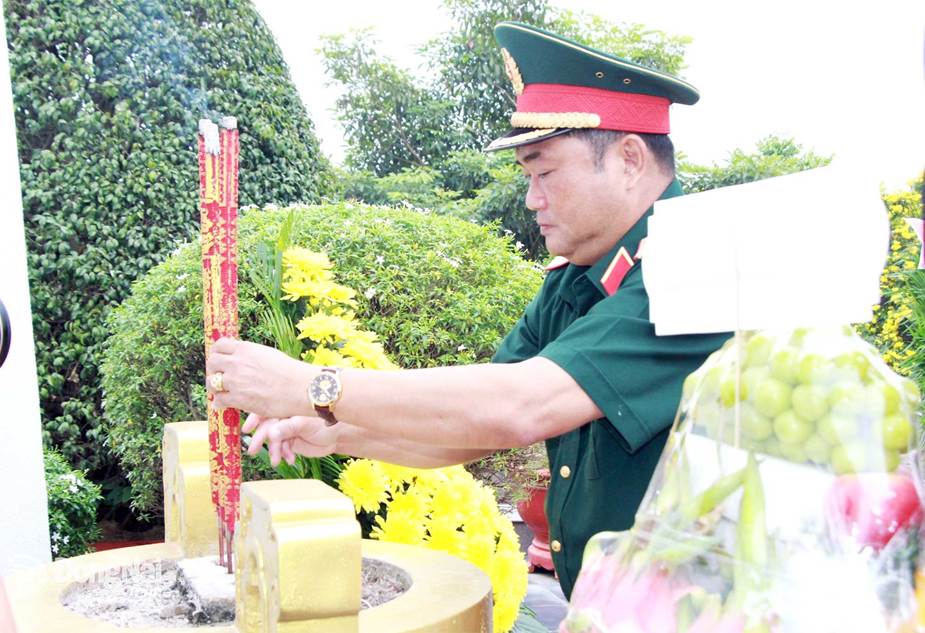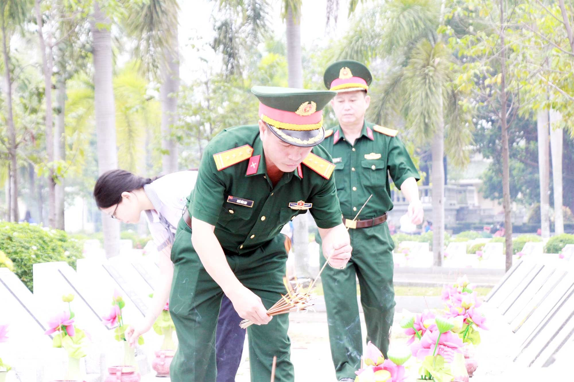 Cán bộ, chiến sĩ lực lượng vũ trang Quân khu 7 thắp hương các mộ phần liệt sĩ. Ảnh: Nga Sơn