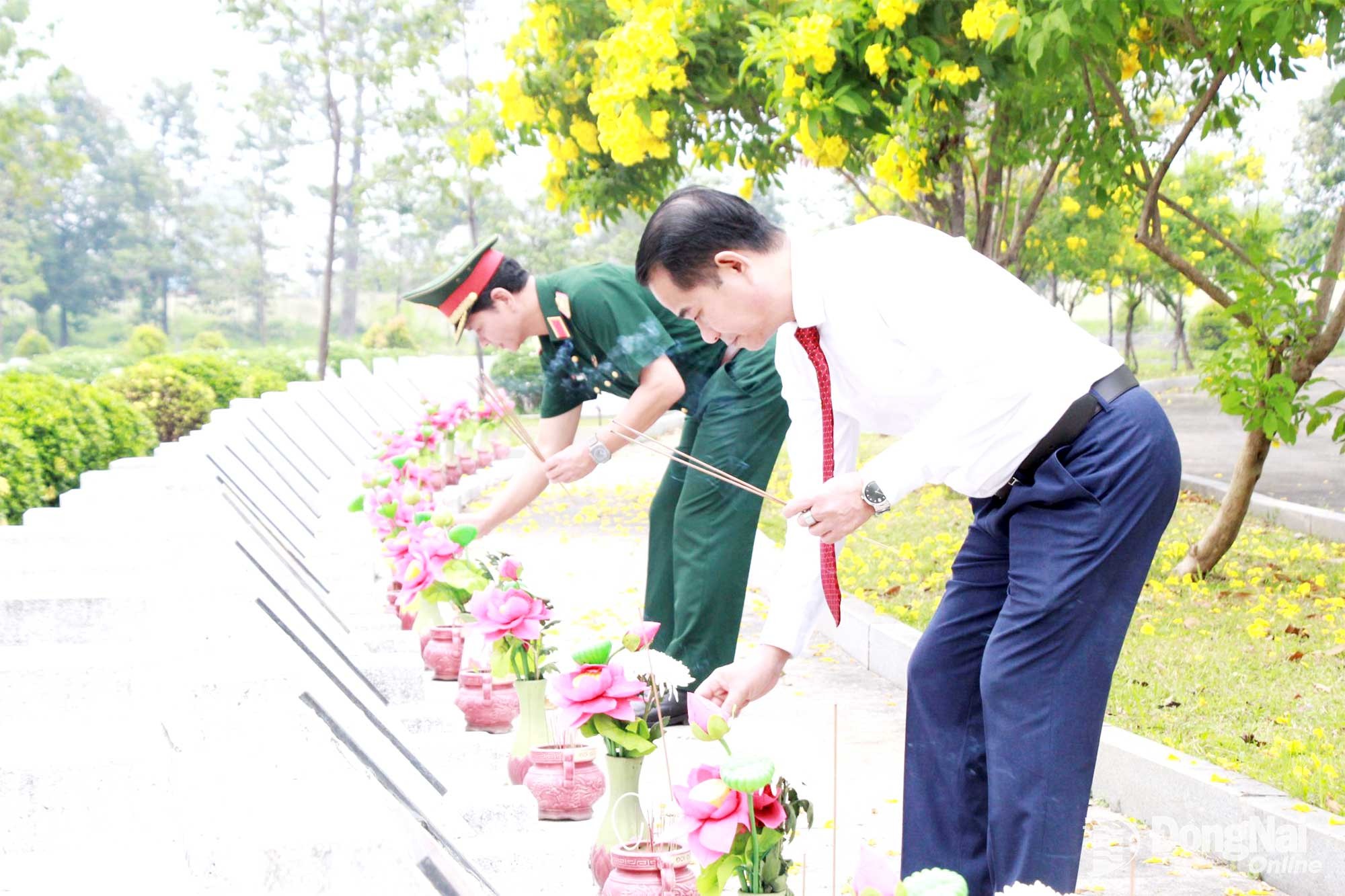 Lãnh đạo tỉnh Đồng Nai và thủ trưởng Quân khu 7 thắp hương các phần mộ liệt sĩ. Ảnh: Nga Sơn