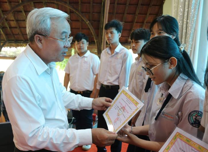 Ủy viên Ban TVTU, Trưởng Ban Dân vận Tỉnh ủy Cao Tiến Dũng trao học bổng cho học sinh sinh viên