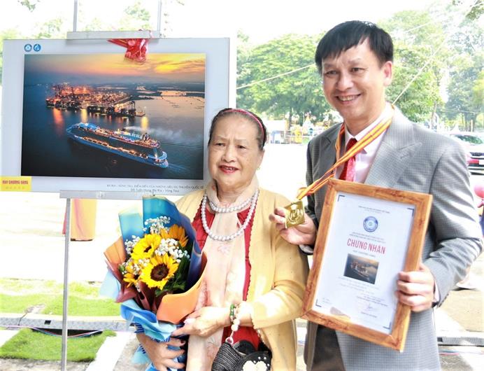 Tác giả Đỗ Tuấn Hùng cùng mẹ bên tác phẩm “Bà Rịa - Vũng Tàu - Điểm đến của những siêu du thuyền quốc tế” đạt huy chương vàng Liên hoan ảnh nghệ thuật khu vực miền Đông Nam bộ lần thứ 30 năm 2023.
