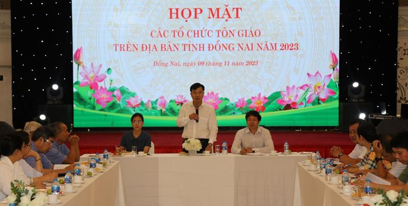 Phó Giám đốc Sở Nội vụ tỉnh Nguyễn Quốc Vũ phát biểu tại chương trình họp mặt các tôn giáo năm 2023