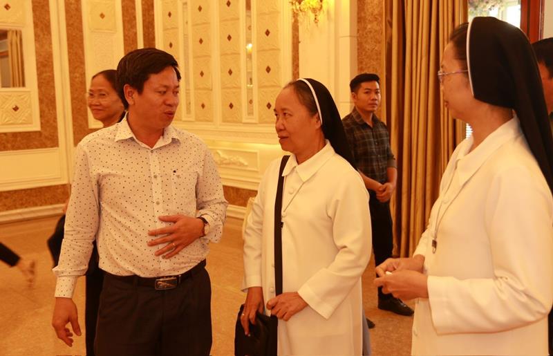 Ông Nguyễn Đình Kiên, Trưởng Ban Tôn giáo tỉnh trao đổi cùng linh mục, tu sĩ các dòng tu Công giáo