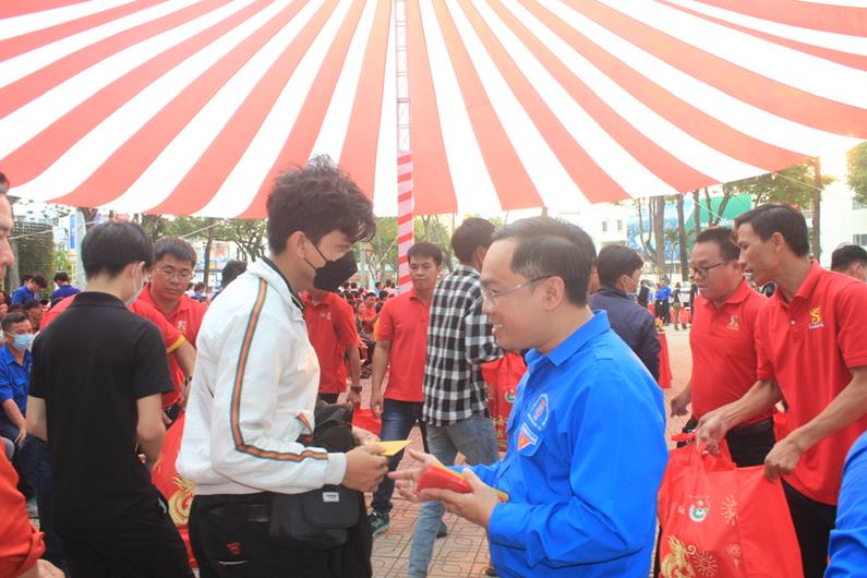 Bí thư Tỉnh đoàn Nguyễn Minh Kiên trao bao lì xì cho thanh niên công nhân, người lao động khó khăn trên địa bàn tỉnh