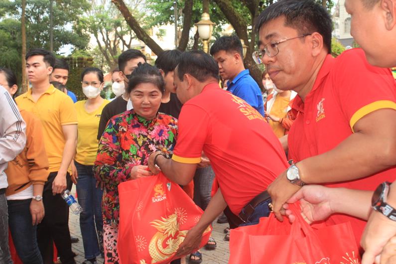 Nhân viên Tổng Công ty CP bia - rượu - nước giải khát Sài Gòn trao quà cho thanh niên công nhân, người lao động khó khăn