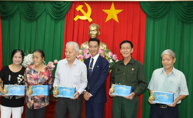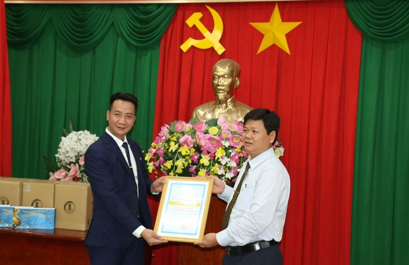 Phó Chủ tịch Ủy ban MTTQ Việt Nam tỉnh Vũ Đình Trung tặng bảng tri ân Công ty cổ phần tập đoàn Phát triển tài chính và công nghệ Trường Sinh đã trao tặng quà cho gia đình chính sách tại Đồng Nai (ảnh: Sông Thao)