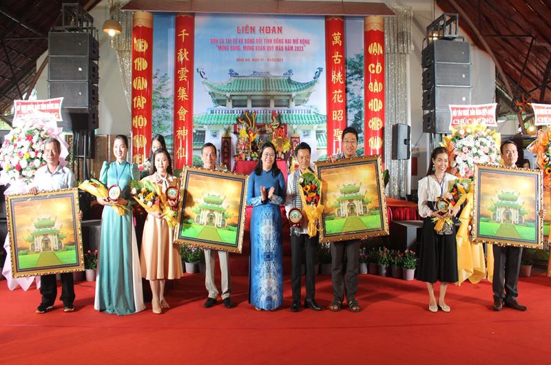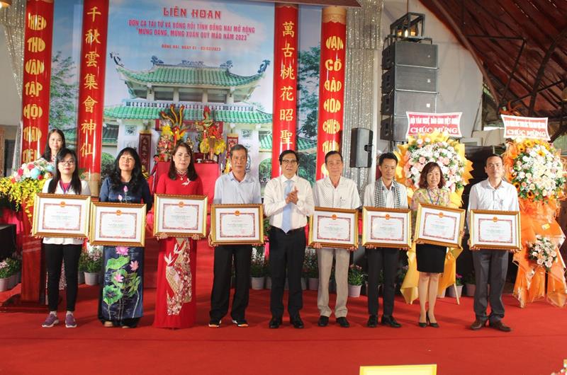 Phó Chủ tịch UBND tỉnh Nguyễn Sơn Hùng trao bằng khen cho các đơn vị tham gia Liên hoan đờn ca tài tử và bóng rỗi tỉnh Đồng Nai mở rộng năm 2023