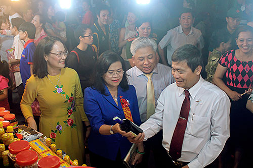 Phó Chủ tịch UBND tỉnh Nguyễn Hòa Hiệp (thứ 2 từ trái sang) tham quan các gian hàng tại Liên hoan ẩm thực Đồng Nai lần thứ VIII-2018.